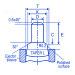 MOULD PIN DESIGN IS CRITICAL TO THE SUCCESS OF THE MOULDING-IN OPERATIONS, SINCE THE FEATURES SHOWN ARE USED TO LOCATE AND RETAIN THE INSERT PRIOR TO MOULDING AND PREVENT THE INGRESS OF PLASTIC DURING THE PROCESS